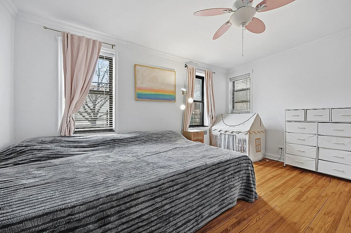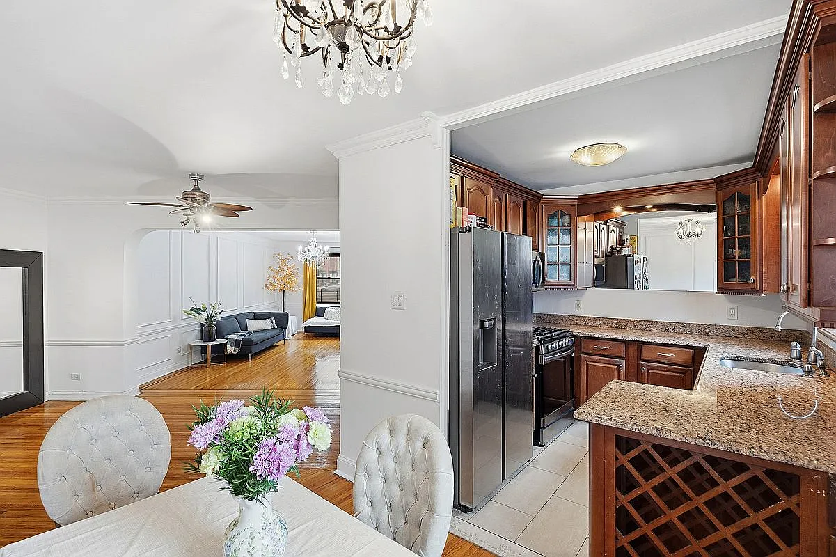 This charming residence features high ceilings, gleaming hardwood floors, and custom designer walls with elegant ceiling moldings, creating a sophisticated and Parisian-inspired aesthetic. Classic pre-war arches enhance the apartment’s timeless character.